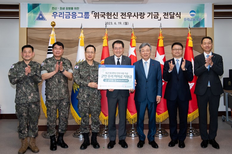 ‘군인 우리(Woori) 히어로’는 나라를 위해 헌신한 순직·공상 군인의 숭고한 희생정신을 기리기 위해 추진됐다. 지원금 전달식은 충남 계룡시에 위치한 계룡대에서 육·해·공군 참모총장이 참석한 가운데 이뤄졌다.