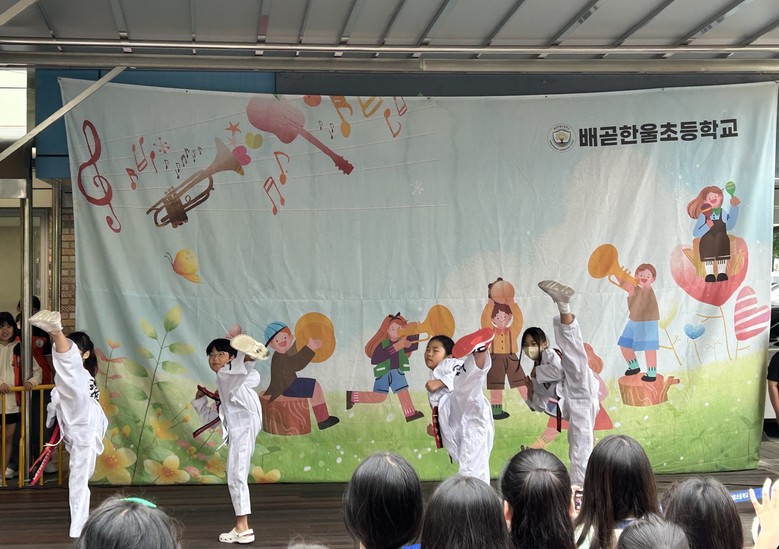 [시흥시 세계타임즈=송민수 기자] 경기도 시흥시 배곧한울초등학교(교장 윤순덕)는 5월 20일부터 5월 28일까지 아침 등교 시간에 등굣길 예술제를 실시하고 있다. 학생들이 무대의 주인공이 되어 댄스, 무술, 악기연주, 노래 등 다양한 분야에서 꿈과 끼를 펼치는 중이다.