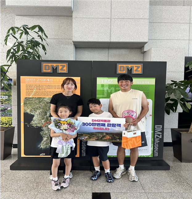 지난 8월 16일(토) 오후 2시 27분, 300만 번째 입장객인 김봉재 씨(강릉 거주)에게는 기념품과 뮤지엄샵 식음료 이용권을 전달하며 축하의 뜻을 전했다. 김 씨는 “여름휴가를 맞아 가족과 함께 디엠제트박물관(DMZ박물관)을 찾아 뜻깊은 이벤트에 당첨돼 기쁘다”면서, “초등학교 1학년인 아들이 디엠제트박물관(DMZ박물관)에 큰 호기심을 보여 평화·통일의 의미와 교육적 경험을 위해 박물관을 찾았다”면서 소감을 밝혔다.