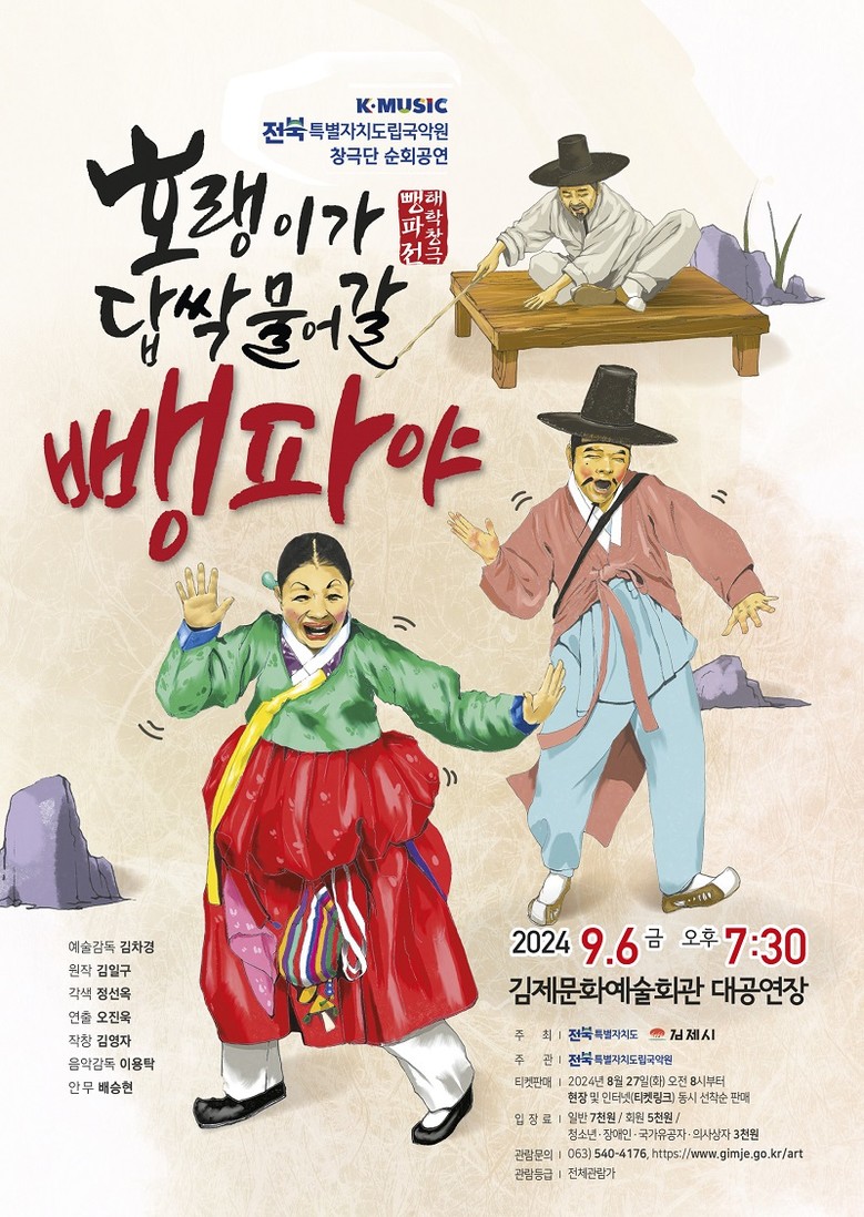 [전북특별자치도립국악원=세계타임즈 이상호 기자] 전통예술의 미래를 여는 전북특별자치도립국악원(원장/유영대) 창극단(예술감독/김차경)은 오는 9월 6일(금) 오후 7시 30분에 김제문화예술회관 대공연장에서 <창극단 순회공연> -‘호랭이가 답싹 물어갈 뺑파야’를 선보인다.