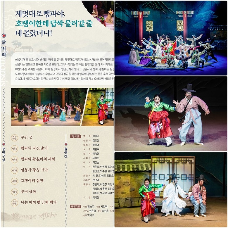 ‘호랭이가 답싹 물어갈 뺑파야’는 1981년에 처음 선보인 김일구 명창의 뺑파전을 재조명한 작품으로, 남녀노소 누구나 쉽게 즐길 수 있도록 현대적 감각과 시대성에 맞춰 새롭게 제작한 공연이다.