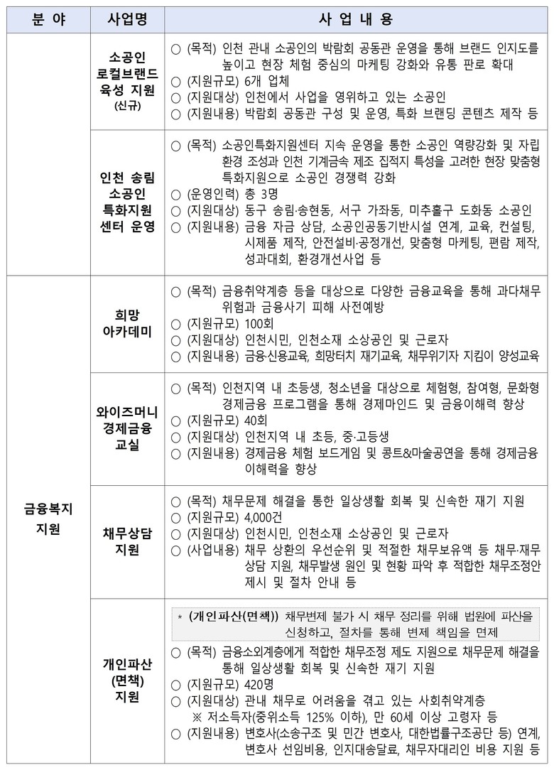 한편 금융소외계층을 위해 채무 상담과 개인파산·면책, 개인회생·워크아웃 등을 지원해 채무 문제 해결을 돕고, 재무 코칭과 금융 교육을 병행해 재무 자립을 지원한다.