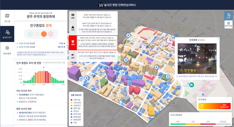 광주시는 그동안 축제현장에 안전관리 배치인력만으로 특이상황을 확인, 전달했던 부분을 실시간 인파관리 서비스를 통해 유동인구 규모를 한눈에 파악하고, 위험요소를 미리 감지할 수 있을 것으로 기대하고 있다.