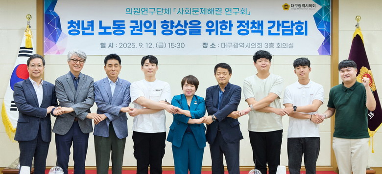 [대구 세계타임즈=한윤석 기자] 대구시의회 의원연구단체인 ‘사회문제해결 연구회’(대표 윤권근 의원)는 9월 12일(금) 오후 3시 30분, 시의회 3층 회의실에서 ‘청년 노동 권익 향상을 위한 정책 간담회’를 개최했다.