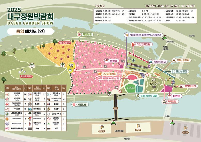 한편, 행사의 시작을 알리는 개막식은 24일(금) 오전 10시 30분 하중도 메인무대에서 열린다. 내빈·정원조성 참여자·시민 등 300여 명이 참석한 가운데 김정기 대구시장 권한대행의 개회사를 시작으로 개막 퍼포먼스, 우수작품 시상, 가드닝 패션쇼 등이 진행된다.
