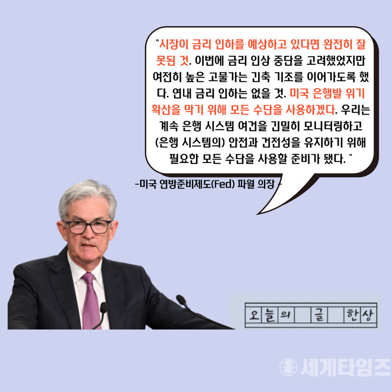 [세계타임즈 백진욱 기자] 미국 연방준비제도(Fed·연준) 의장 제롬 파월이 “금리 인하는 없다.”라고 못을 박으며 FOMC에서 달러금리 0.25%P 인상했다. 또한 그는 미국 은행발 위기 확산을 막기 위한 “모든 수단”을 사용하겠다고 강하게 의사를 밝혔다.