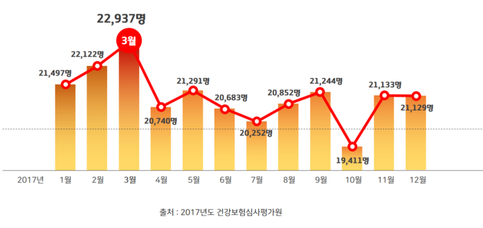 2만2937명으로 3월을 제외한 월별 평균수치 2만939명 보다 2000명 가량 발병률이 증가한 것으로 나타났다.