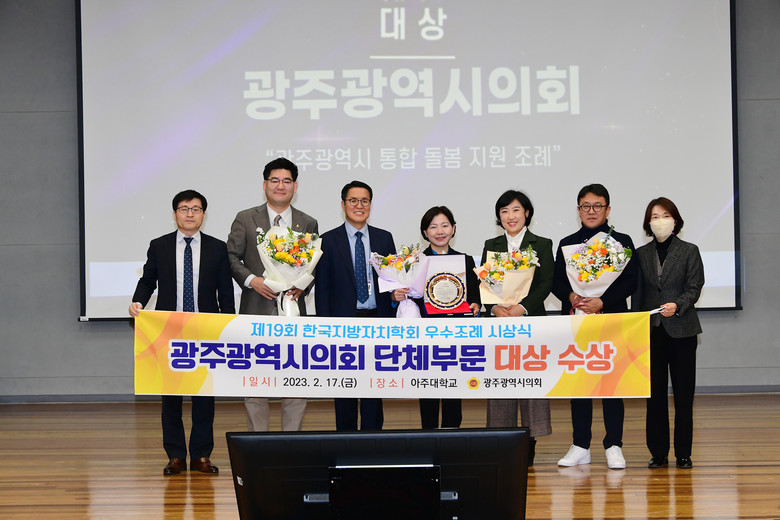 [광주 세계타임즈=손권일 기자] 광주광역시의회(의장 정무창)는 지난 17일, 아주대학교 율곡관에서 열린 제19회 한국지방자치학회 우수조례 시상식에서 단체부문 ‘대상’, 의원 개인부문 ‘최우수상’과 ‘공무원’을 수상하였다.