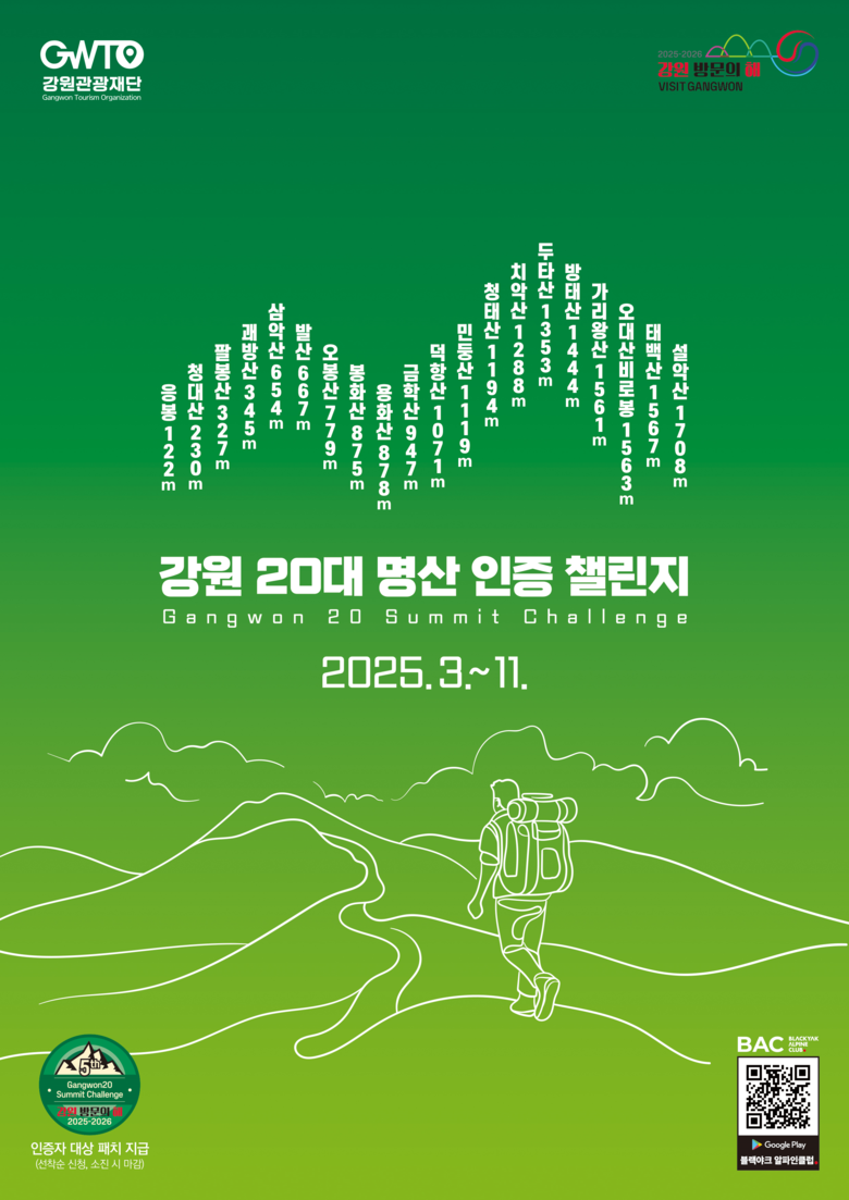 5년 차에 접어든 강원 20대 명산 인증챌린지는 작년 기준 8만 명 이상이 참여한 재단의 인기 프로그램이다. 금년도 인증챌린지는 3월부터 11월까지 운영하며 양구 봉화산과 영월 발산이 새롭게 추가되었다. 그 중 양구 봉화산의 백자 모양 정상석은 포토존 명소로 입소문이 난 곳이며 영월 발산은 전통시장과 인접하여 접근성이 좋다.