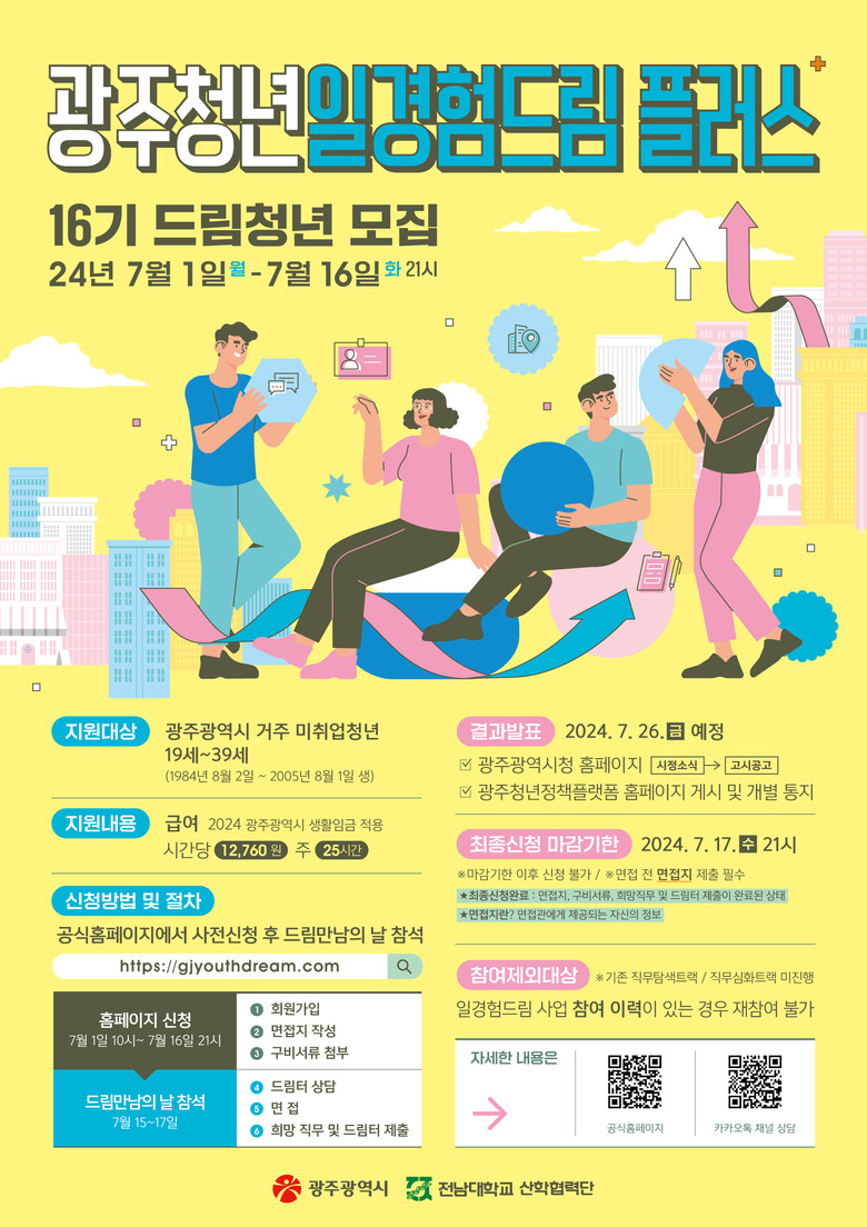 문의는 카카오톡채널 ‘광주청년드림’과 광주청년 일경험드림플러스 사업단으로 하면 된다.