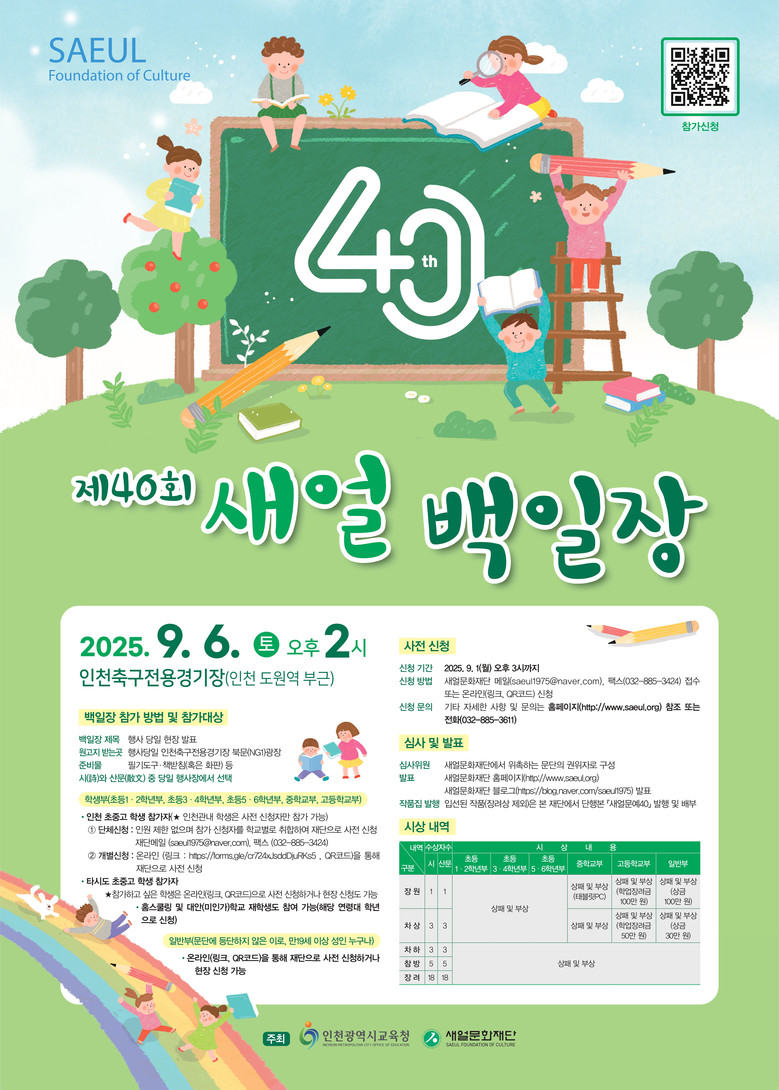 대회는 ▲초등 1·2학년 ▲초등 3·4학년 ▲초등 5·6학년 ▲중학교부 ▲고등학교부 ▲일반부로 나눠 진행되며, 사전 신청은 9월 1일(월)까지 새얼문화재단 사무국에서 접수한다.