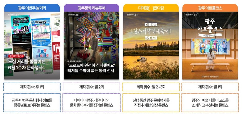 ‘디어마이광주’는 2019년 기본계획을 수립해 2020년 시범 운영을 거쳐 2022년 정식 개설했다. 현재는 ▲주간 문화정보 콘텐츠 ‘광주 이번주 놀거리’ ▲문화행사 리뷰 공유 커뮤니티 ‘광주문화 리뷰투어’ ▲예술 콜라보 프로젝트 ‘예술가를 찾습니다’ 등 다양한 프로그램을 운영 중이다.