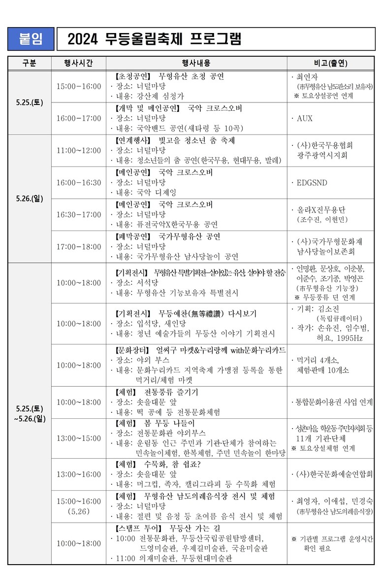 축제 첫째날인 25일에는 광주시무형유산 남도판소리 보유자(최연자) 초청 공연을 시작으로, 전통문화를 현대적으로 재해석한 TV프로그램 ‘풍류대장-힙한 소리꾼들의 전쟁’에서 전국적으로 이름을 알린 퓨전국악밴드 ‘억스(AUX)’의 무대가 펼쳐진다.