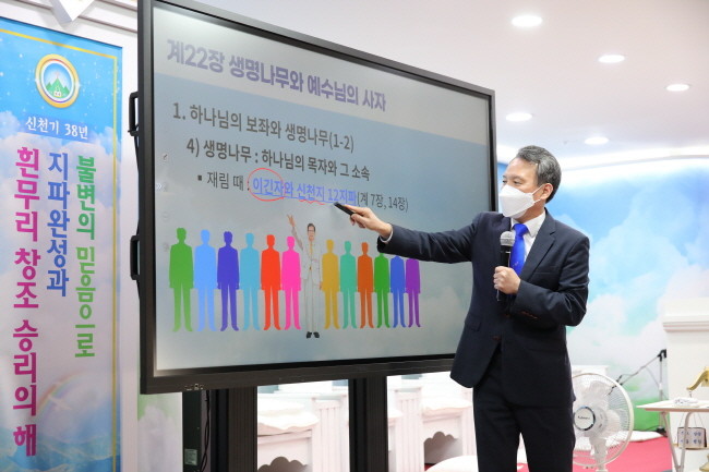 이어 "재림 때의 생명나무의 실체는 뜻이 하늘에서 이룬 것 같이 땅에서도 이룬다는 말씀처럼, 생명나무의 실체이신 예수님과 예수님의 열두 제자들이 함께 하는 계시록 7장과 14장의 이긴자와 신천지 열두 지파가 된다"고 설명했다.