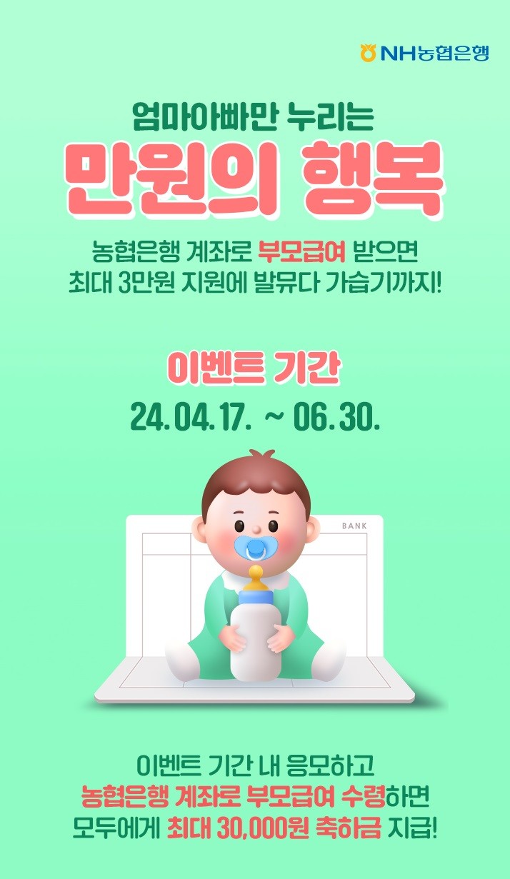 본 이벤트는 2024년 1월부터 3월까지 농협은행 계좌로 부모급여를 수령한 적 없는 고객이 4월부터 농협은행 계좌로 부모급여를 신규 수령하고 이벤트 기간 내에 응모하면 된다.