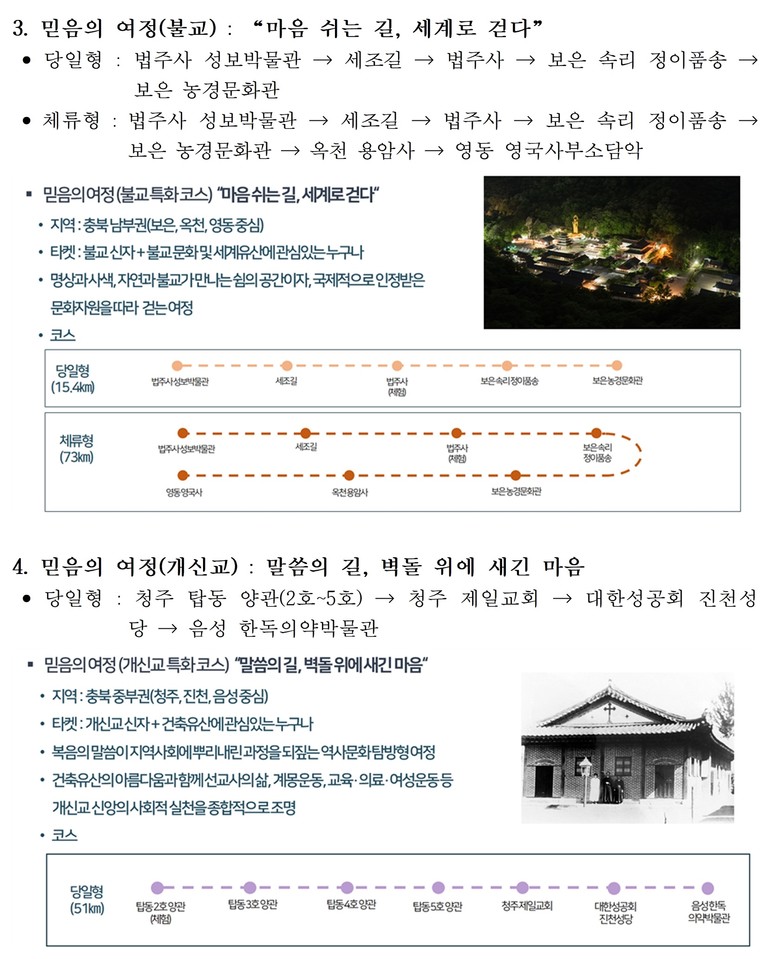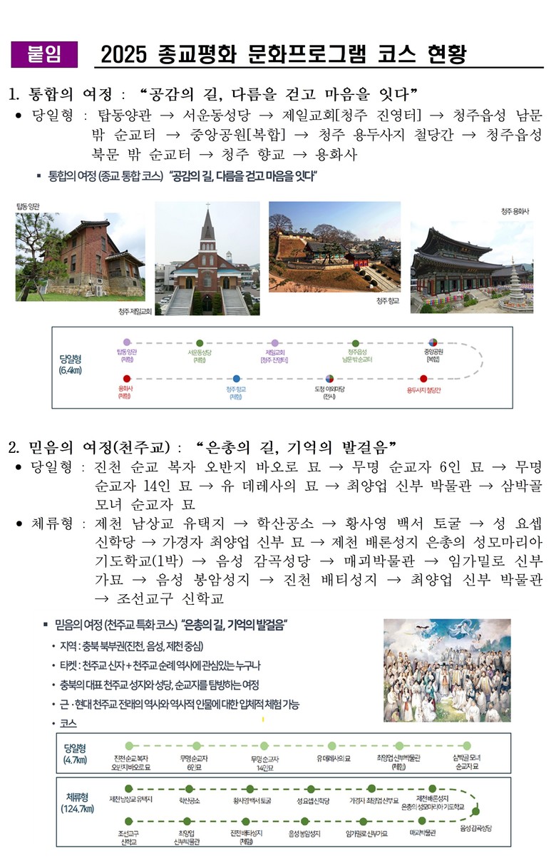 특히, 이번 사업의 핵심 콘텐츠인 충북 ‘어울리길’은 서로 다른 종교와 문화를 가진 사람들이 차이를 넘어 함께 소통하고, 상호이해하며 조화롭게 어우러지는 충북의 종교문화 탐방길이다.