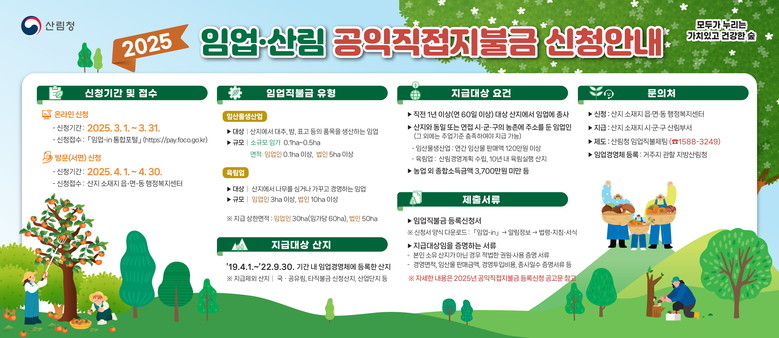 [진주시 세계타임즈=최성룡 기자] 경상남도 진주시는 3월 1일부터 4월 30일까지 2025년 임업·산림 공익직접지불금(이하 ‘임업직불금’) 신청 접수를 실시한다고 밝혔다.
