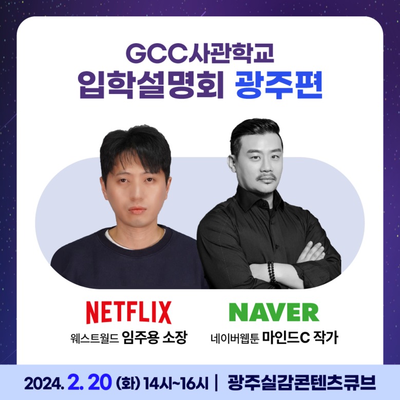 [광주 세계타임즈=손권일 기자] 광주광역시(시장 강기정)는 오는 14일 오후 2시 서울 위드스페이스, 20일 오후 2시 광주 실감콘텐츠큐브에서 ‘GCC 사관학교 입학설명회’를 연다.