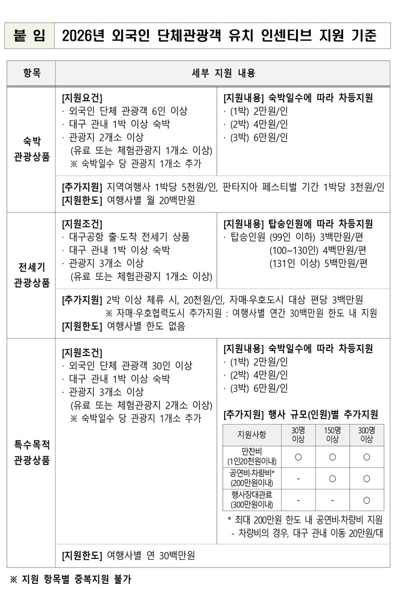 2026년 외국인 단체 관광객 유치 인센티브 지원에 관한 세부 기준과 신청 방법은 대구문화예술진흥원 대구관광 B2B 정보교류 사이트(visitdaegu.or.kr)에서 확인할 수 있다.