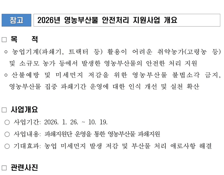 이는 ‘미세먼지 계절 관리제’와 연계한 「2026년 영농부산물 안전 처리 지원사업」의 하나로 시행되며, 농경지 내 논두렁·밭두렁 태우기 및 영농부산물 소각 행위를 금지하여 미세먼지 및 산불 예방과 병해충 발생을 최소화하는 것이 목적이다.