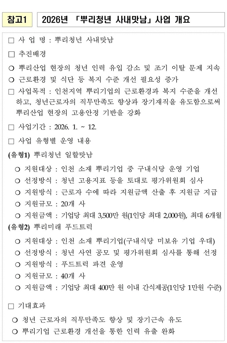 ▶ 뿌리청년 일할맛남: 구내식당을 보유한 인천 소재 뿌리기업에 근로자 1인당 최대 2,000원의 식단 개선비를 지원한다. 기업 규모에 따라 최대 3,500만 원까지 지원받을 수 있다.