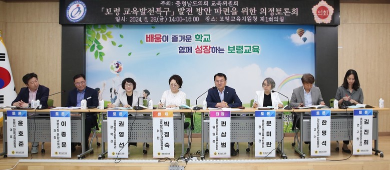 이번 토론회의 좌장은 충남도의회 교육위원회 편삼범 위원장(보령2·국민의힘)이 맡고, 박정숙 교육발전특구 자문위원회 위원이 주제 발표를 진행했다. 또한 문미란 충남교육청 미래교육추진센터장, 권영선 보령교육지원청 교육과 과장, 이종문 보령시청 문화교육과 과장, 김진희 충남연구원 충남라이즈센터 책임연구원, 한명석 아주자동차대학교 산학협력단 교수, 윤호준 보령시마을교육공동체 대표가 토론자로 참여해 다양한 의견을 나누었다.