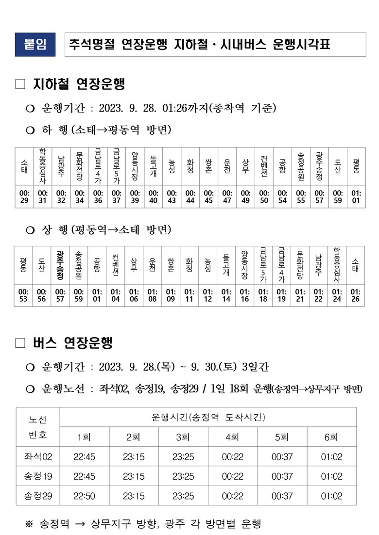 <시내버스 연장운행> · 연장운행기간 : ’23.9.28.~9.30.(3일간) · 송정역 정차시간(송정역→상무지구 방면) - (좌석02),(송정19) 22:45, 23:15, 23:25, 00:22, 00:37, 01:02 - (송정29) 22:50, 23:15, 23:25, 00:22, 00:37, 01:02 |
