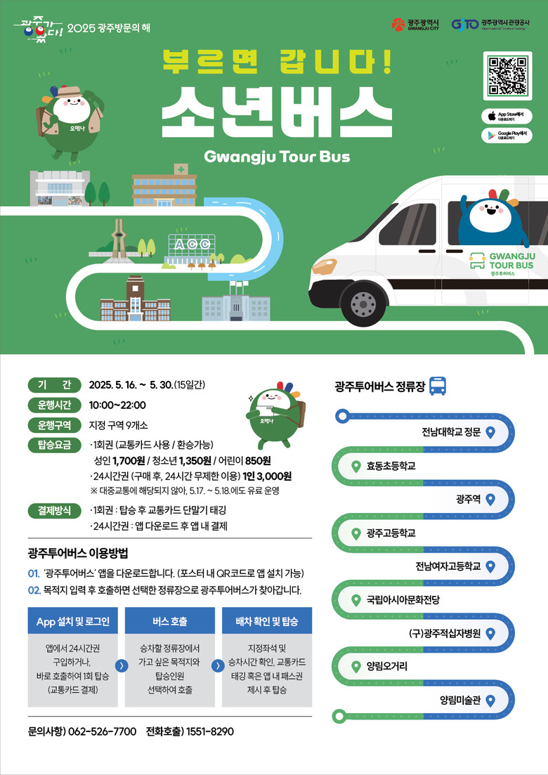 자세한 내용은 광주문화관광 오매광주 누리집(tour.gwangju.go.kr)과 광주관광공사 대표 누리집(www.gjto.or.kr)에서 확인할 수 있다. 광주투어버스 앱은 애플 앱스토어와 구글 플레이스토어에서 내려받을 수 있다.