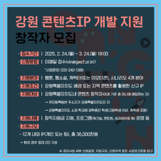 ‘2025년 강원 콘텐츠IP 개발 지원’사업은 도내 콘텐츠 창작자 발굴 및 문화콘텐츠 산업 저변 확대를 위해 추진되며, 창작 지원금 지급과 전문가 멘토링 등을 통해 도내 창작자들의 역량 강화를 지원하는 사업이다.