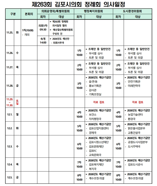 [김포시 세계타임즈=송민수 기자] 김포시의회(의장 김종혁, 이하 시의회)가 11월 25일부터 12월 17일까지 23일간 제263회 정례회를 운영한다. 이번 정례회에서는 2026년도 본예산안과 기금운용계획안, 각종 조례안·동의안 등 시민생활과 직결된 주요 안건들이 심사될 예정이다.