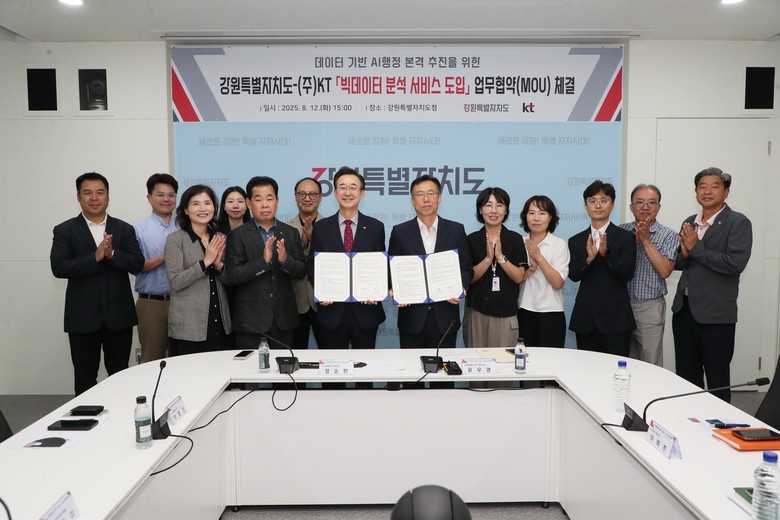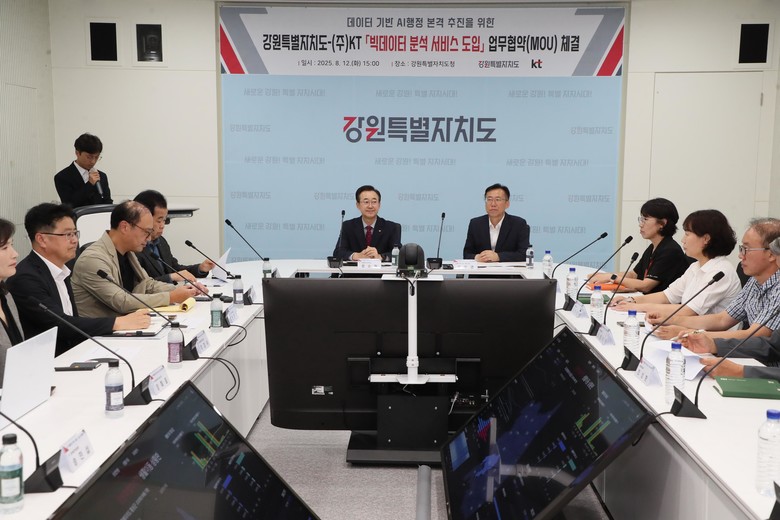 [강원도 세계타임즈=김민석 기자] 강원특별자치도(도지사 김진태)는 ㈜케이티(KT)와 8월 12일(화), 도 영상회의실에서 데이터 기반 에이아이(AI)행정 본격 시행을 위한 「민간데이터 공동활용 추진 업무협약(MOU)」을 체결하였다.