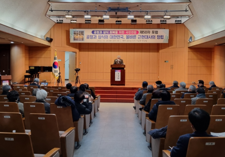 [세계타임즈 백진욱 기자] 지난 20일 오후 3시 《공정과 상식 회복을 위한 국민연합》이 “공정과 상식의 대한민국, 올바른 근현대사의 정립”를 주제로 송상현 서울대학교 명예교수(전 국제형사재판소소장)를 초청하여 매헌윤봉길의사기념관에서 제50차 포럼을 개최했다.