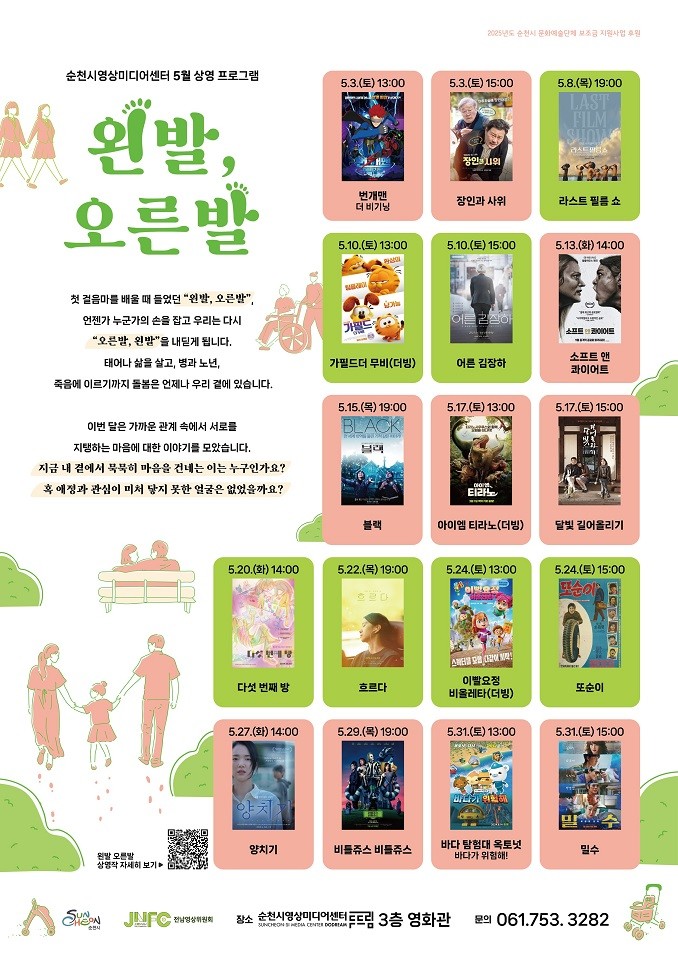 특히, 5월 첫째, 둘째 주에는 ‘2025 어린이가 그리는 영화로운 순천’ 사업의 일환으로 어린이를 위한 영화 <번개맨 : 더 비기닝>, <가필드 더 무비(더빙)>를 상영한다. 이외에도 <어른 김장하>, <블랙>, <양치기> 등은 다양한 돌봄의 모습을 조명하고 가까운 관계를 돌아보는 계기를 마련할 예정이다.