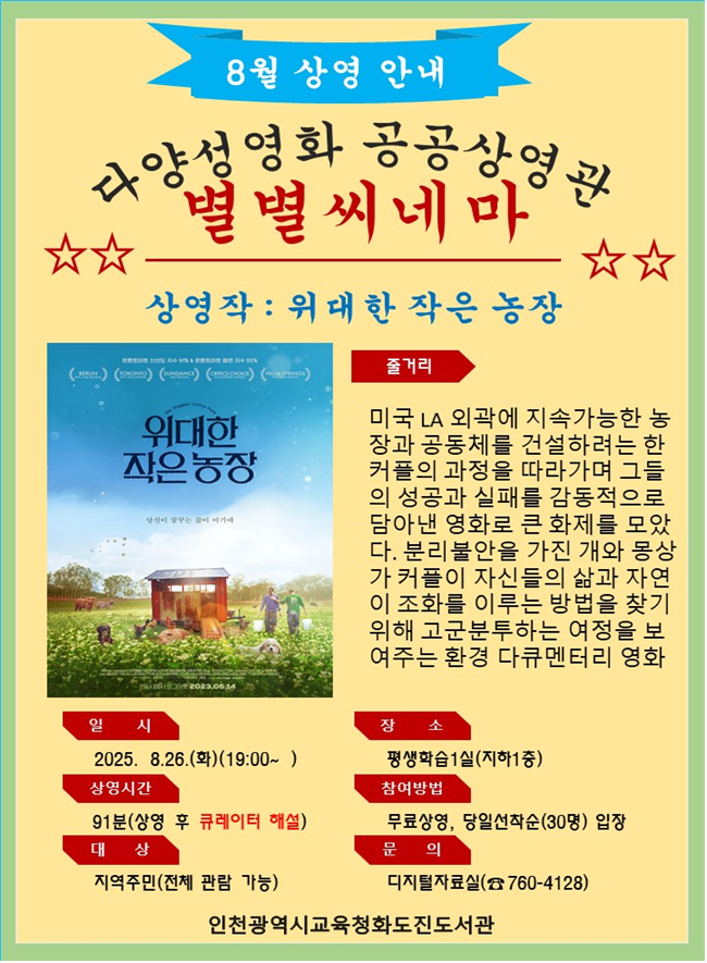 프로그램은 11월까지 매월 넷째 주 화요일 오후 7시, 화도진도서관 평생학습 1실에서 진행되며, 8월 26일 상영작은 존 체스터 감독의 ‘위대한 작은 농장’이다.