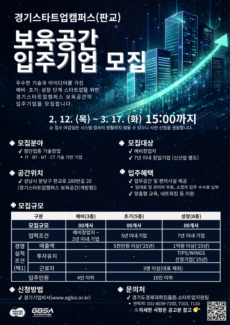 신청은 오는 12일부터 다음달 17일 오후 3시까지 경기기업비서에서 온라인으로 접수하면 된다. 최종 선정 결과는 4월 중 개별 통보되며, 선정된 기업은 오는 5월부터 입주를 시작할 예정이다.