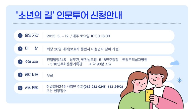 아울러 ‘소년의 길’ 속 소설 ‘소년이 온다’와 관련한 주요 장소들을 직접 걷고 탐방하며 오월 정신을 되새길 수 있는 인문투어 프로그램도 운영한다. 오는 5월 17일부터 12월까지 매주 토요일 오전 10시30분, 오후 4시 두 차례 운영한다. 프로그램 소요 시간은 약 90분이다. 참여 비용은 무료로, 전일빌딩245사업단에 전화(062-233-0245/062-613-2492) 문의하거나 현장 접수를 통해 신청하면 된다.
