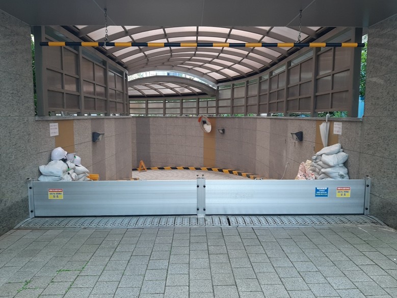 침수방지시설(물막이판)은 주택의 침수 피해를 방지하기 위해 출입구 등에 설치하는 시설로 주로 지하주차장 진출입구와 반지하주택 출입구 등에 설치한다.
