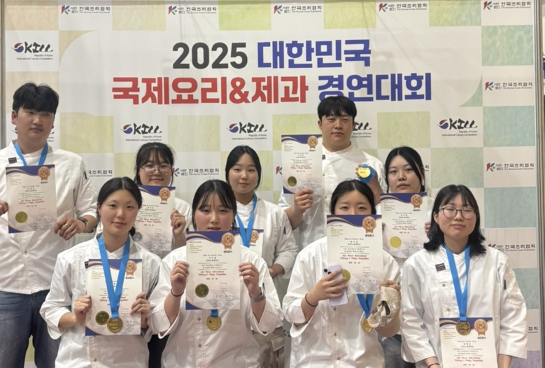 [강원도 세계타임즈=김민석 기자] 강원도립대학교(총장 김광래)는 바리스타제과제빵과 2학년 재학생 9명이 5월 24일(토) 서울 aT센터에서 열린 ‘2025 대한민국 국제요리&제과경연대회’ 디저트 전시부문에 참가해 전원 수상하는 쾌거를 이뤘다고 밝혔다.
