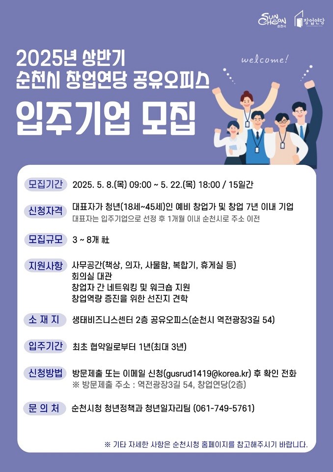 신청자격은 청년(18세~45세)인 예비창업가 또는 창업 7년 이내 기업으로 대표자가 순천시민이거나 합격 후 1개월 내 순천시로 주소 이전이 가능한 자이며, 시 3대 주력 산업인 애니메이션·웹툰, 우주·방위산업, 그린바이오 분야의 기업을 우선 선발할 예정이다.