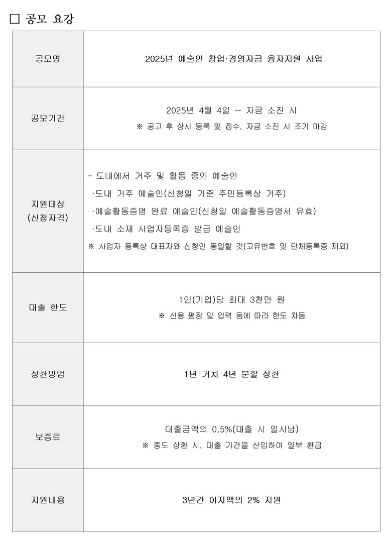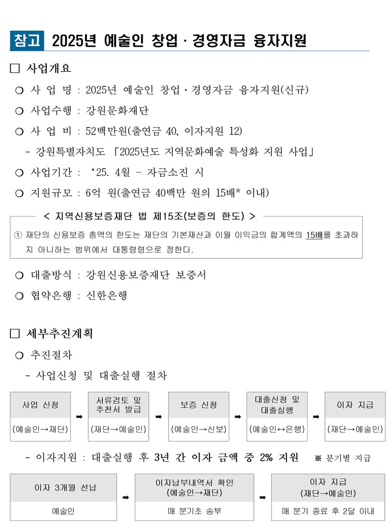 이 사업은 도내에 사업장을 둔 예술인들을 대상으로 하며, 강원문화재단에 사업 신청을 하면 강원신용보증재단과 협력하여 대출 보증서를 발급, 총 6억 원의 한도 내에서 개인별 3천만 원의 대출과 연 2%의 이자를 3년간 지원하는 사업이다.