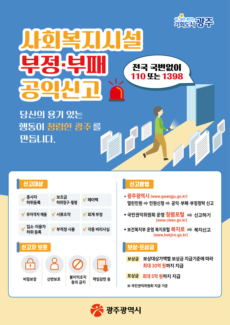 광주시는 이를 위해 5개 자치구와 함께 지역 사회복지시설 2223개소에 공익신고 홍보포스터 4000부를 이달 중 제작·배포할 계획이다.