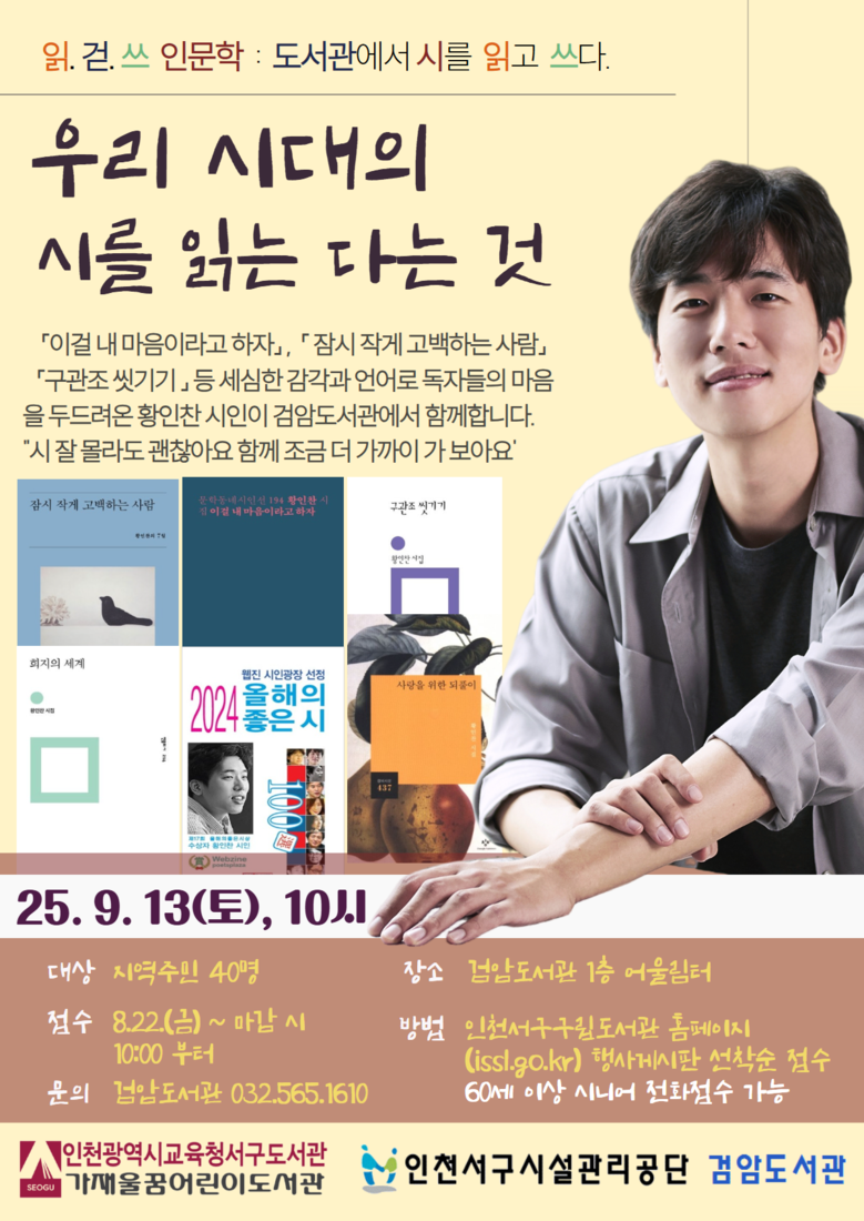 참가 신청은 8월 22일(금) 오전 10시부터 가능하며, 자세한 내용은 인천서구구립도서관 누리집(https://www.issl.go.kr)을 참고하거나 서구도서관(☎032-585-7182) 또는 검암도서관(☎032-565-1610으로 문의하면 된다.