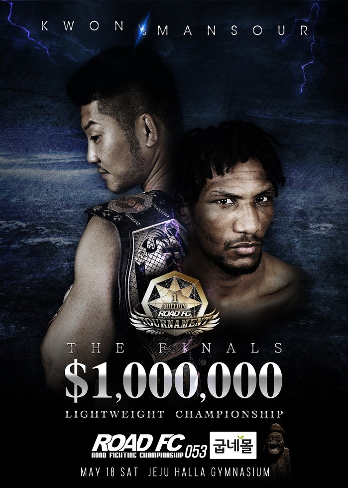 [세계타임즈 김인수기자] ROAD FC (로드FC)가 제주 한라체육관에서 개최하는 굽네몰 ROAD FC 053은 5월 18일에 열린다. 메인 이벤트로 권아솔과 만수르 바르나위가 맞붙는다. 두 파이터의 대결은 ROAD FC의 글로벌 프로젝트 100만불 토너먼트의 최종전이다.
