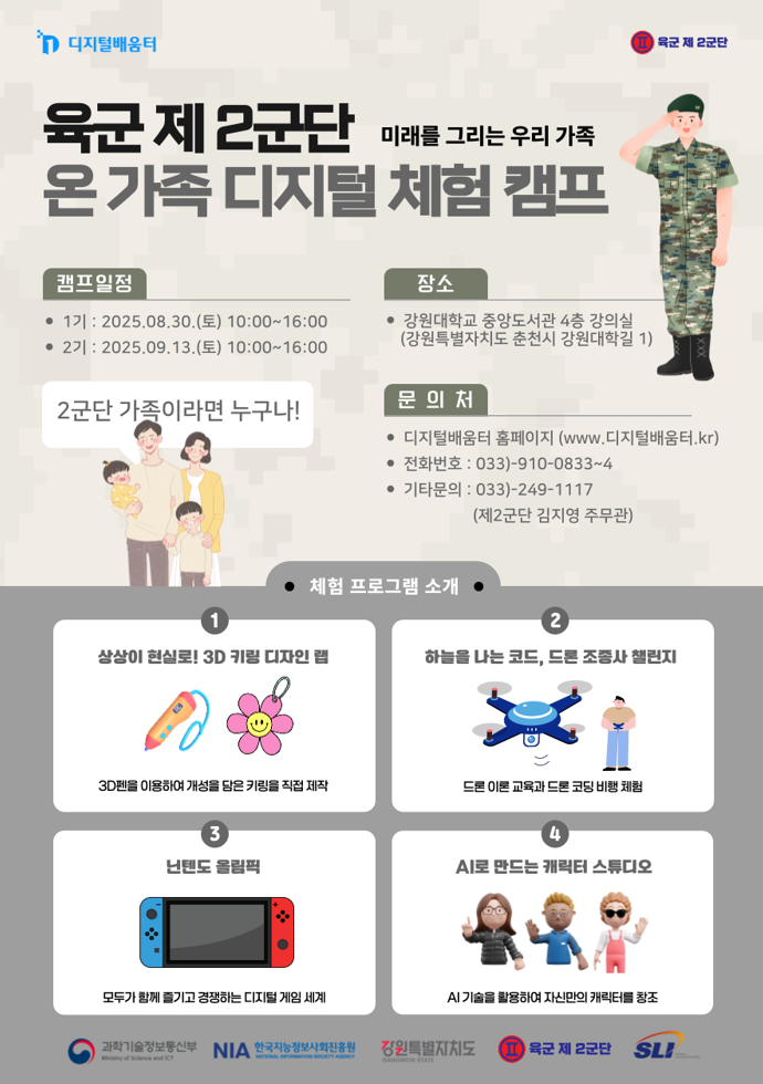 - 오는 8월 30일과 9월 13일에 각각 운영되는 이번 캠프는 군 장병 가족들과 함께 3D펜으로 나만의 키링 제작, 드론 코딩 비행 체험, 닌텐도 게임을 통한 디지털 올림픽, 에이아이(AI) 캐릭터 창작 스튜디오 등 다채로운 체험 부스를 순회하며 디지털 세상을 즐길 수 있다.