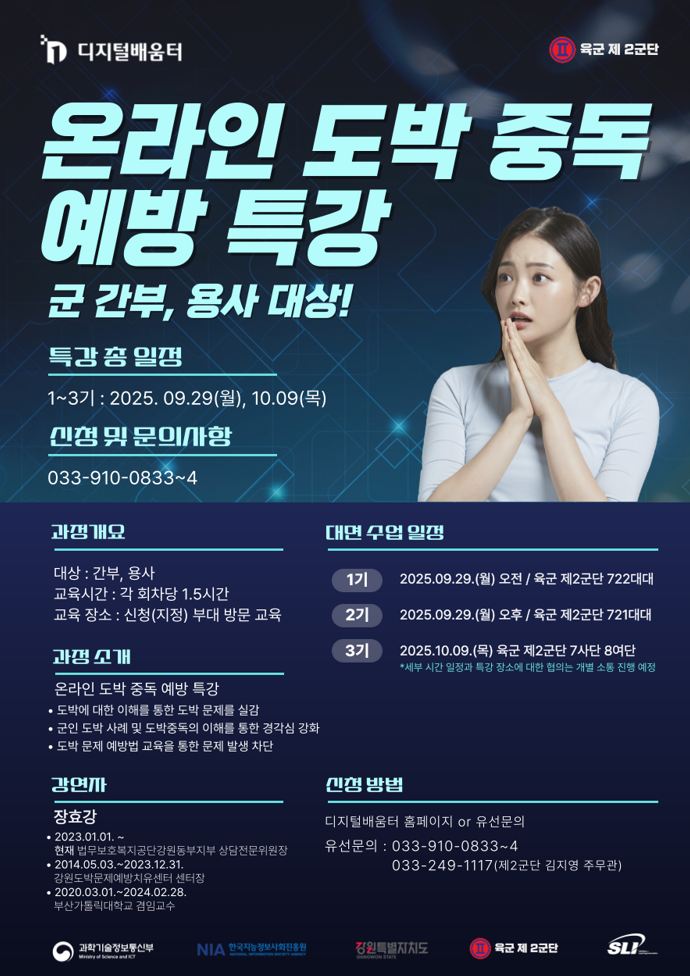 - 최근 사회적으로 큰 문제로 떠오른 온라인 도박은 군 장병들에게도 잠재적인 위험 요소다. 이에 따라 도는 전문 강사를 초빙해 군인 도박 사례, 도박 중독의 심각성, 예방 교육 등을 진행한다.