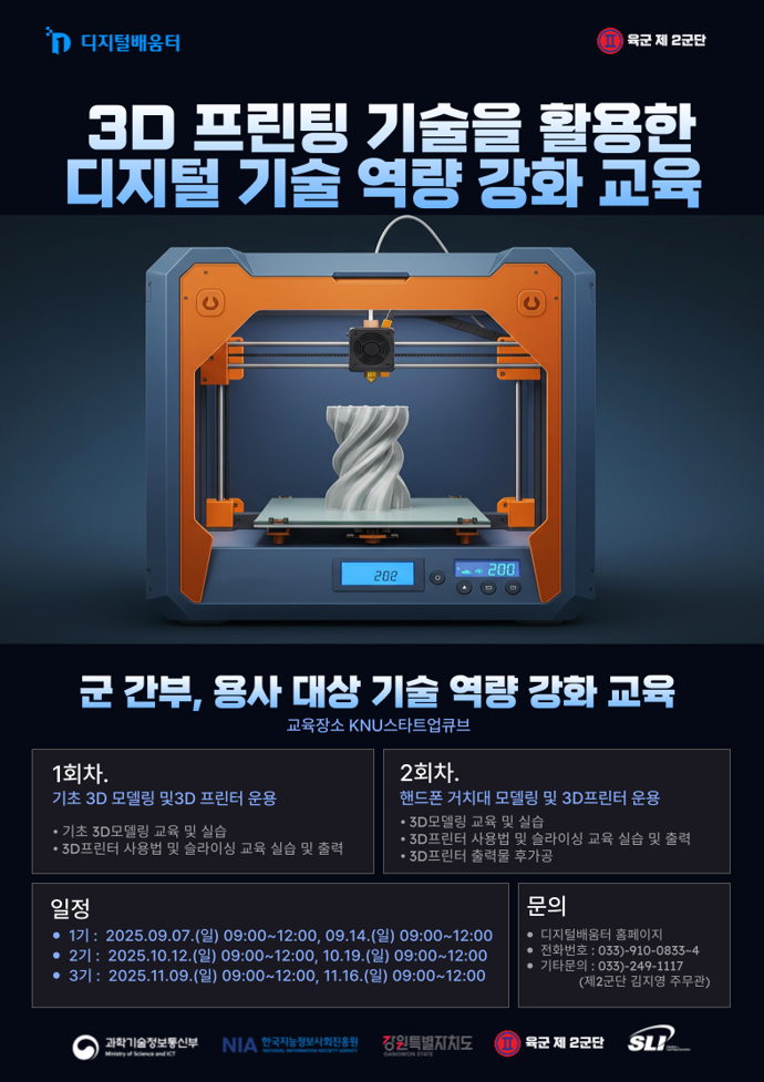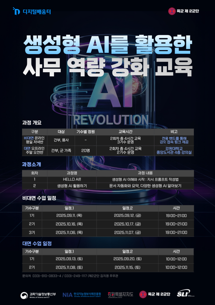 이번 사업은 춘천에 주둔한 육군 제2군단 소속 장병을 대상으로 진행된다. 군 복무를 단순한 의무가 아닌 미래를 준비하는 시간으로 확장해, 청년 장병들이 디지털 전환 시대에 필요한 역량을 키울 수 있도록 지원하는 광역자치단체 최초의 군 특화 디지털 교육 프로그램이다.