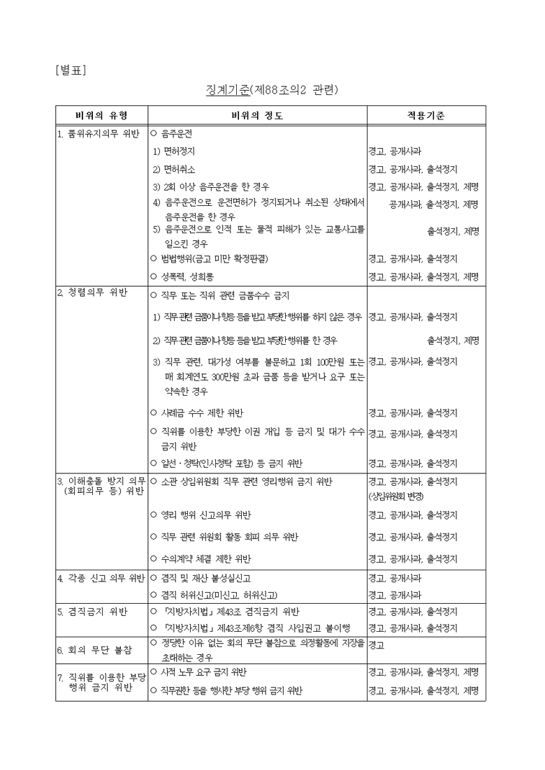 이번 개정안에는 의원의 대표적 의무사항과 「지방자치법」상 금지의무 위반행위를 7개 유형으로 구분하고, 그 위반정도에 따라 ‘경고 → 공개사과 → 출석정지 → 제명’까지 징계 수준을 구체적으로 설정했다.