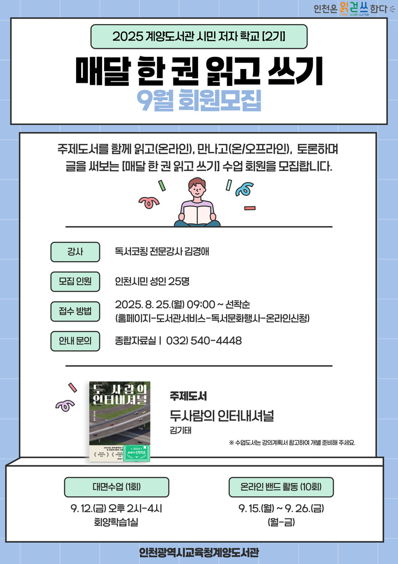 참여 신청은 8월 25일부터 계양도서관 누리집에서 가능하며, 자세한 내용은 계양도서관 누리집(https://lib.ice.go.kr/gyeyang) 공지사항을 참고하거나 종합자료실(☎032-540-4448)로 문의하면 된다.