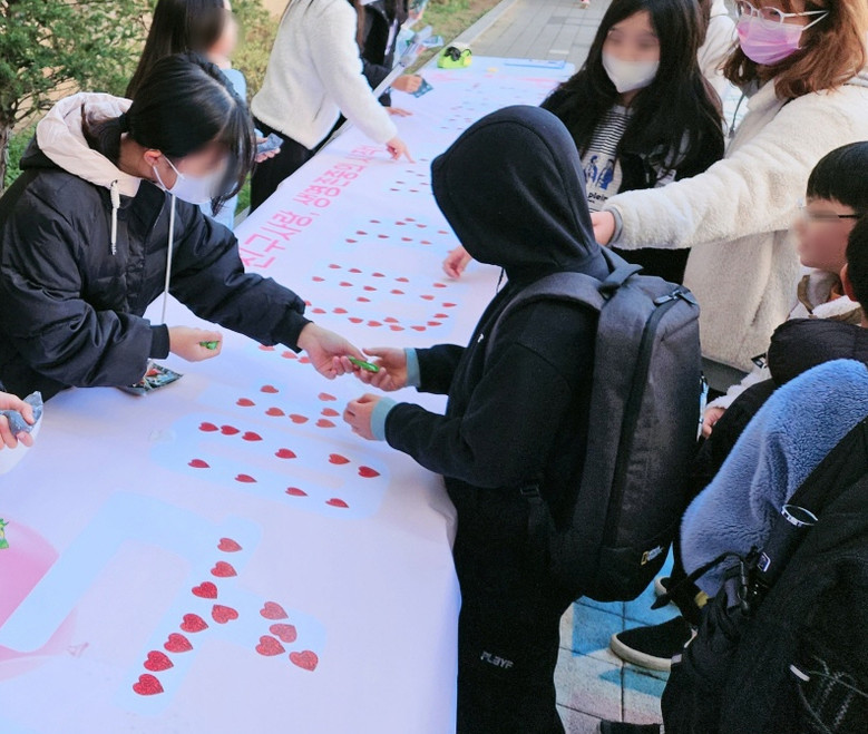 특히 청소년모바일상담센터와 함께 운영하는 학생동아리인 '생명존중의 숲'에서는 <친구사랑, 생명존중의 시작>이라는 주제로 전교생이 참여할 수 있는 특별한 캠페인을 기획하였다. 친구사랑과 생명존중의 의미를 담은 문구를 하트로 채우는 이번 캠페인을 통해 학생들은 친구사랑과 생명존중의 중요성을 경험할 수 있었다.