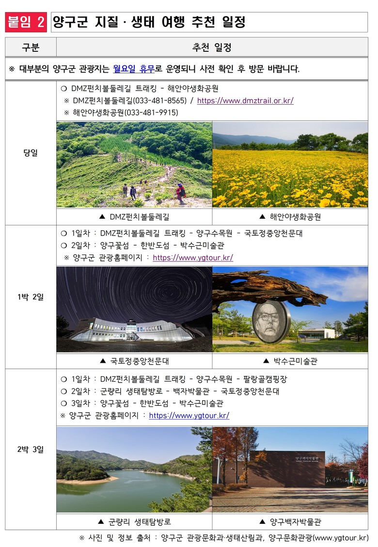 인근에는 △‘양구수목원’의 사계절 식물 관람과 △‘양구백자박물관’의 백자 만들기 체험, △‘해안야생화공원’의 천연원료 화장품 제작 등 가족 단위 방문객이 즐길 수 있는 다양한 체험이 마련되어 있다.